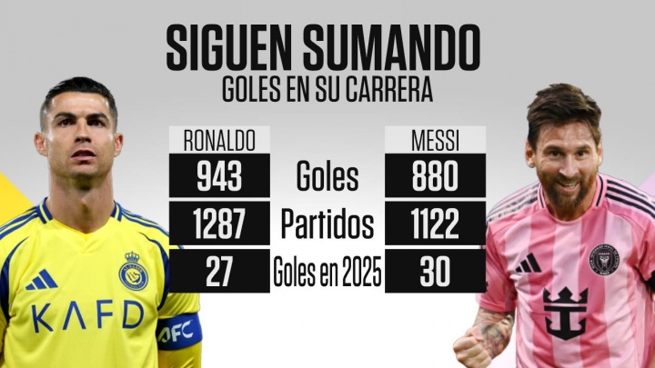 ESPN統計梅羅生涯數據,梅西1122場(chǎng)打進(jìn)880球,2025年打進(jìn)30球;C羅1287場(chǎng)打進(jìn)943球,2025年打進(jìn)27球。