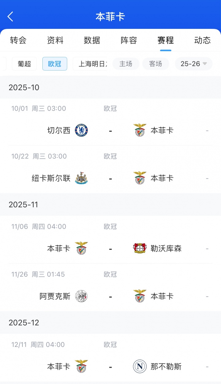 本菲卡首輪歐冠遭遇阿塞拜疆球隊卡拉巴赫逆轉。接下來(lái)本菲卡在歐冠會(huì )面對切爾西(穆帥前東家)、紐卡、勒沃庫森、阿賈克斯、那不勒斯、尤文、皇馬(穆帥前東家)。