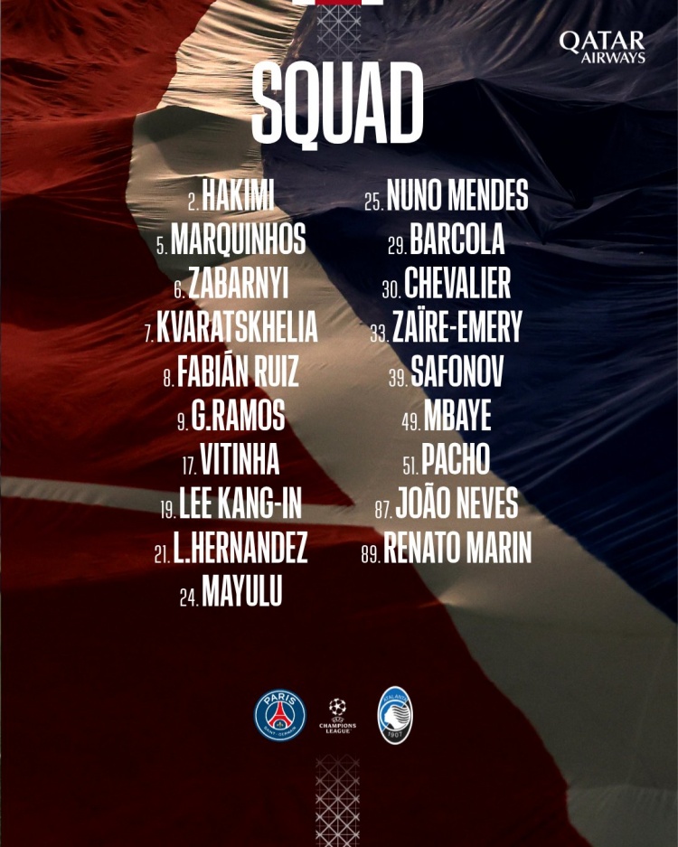 巴黎歐冠大名單:2-阿什拉夫、5-馬爾基尼奧斯、6-扎巴爾尼、7-克瓦拉茨赫利亞、8-法比安-魯伊斯、9-貢薩洛-拉莫斯、17-維蒂尼亞、18-李剛仁、21-盧卡斯-埃爾南德斯、24-馬尤盧、25-努諾-門(mén)德斯、29-巴爾科拉、30-舍瓦利耶、33-小埃梅里、39-薩福諾夫、49-姆巴耶、51-帕喬、87-若昂-內維斯、89-馬林