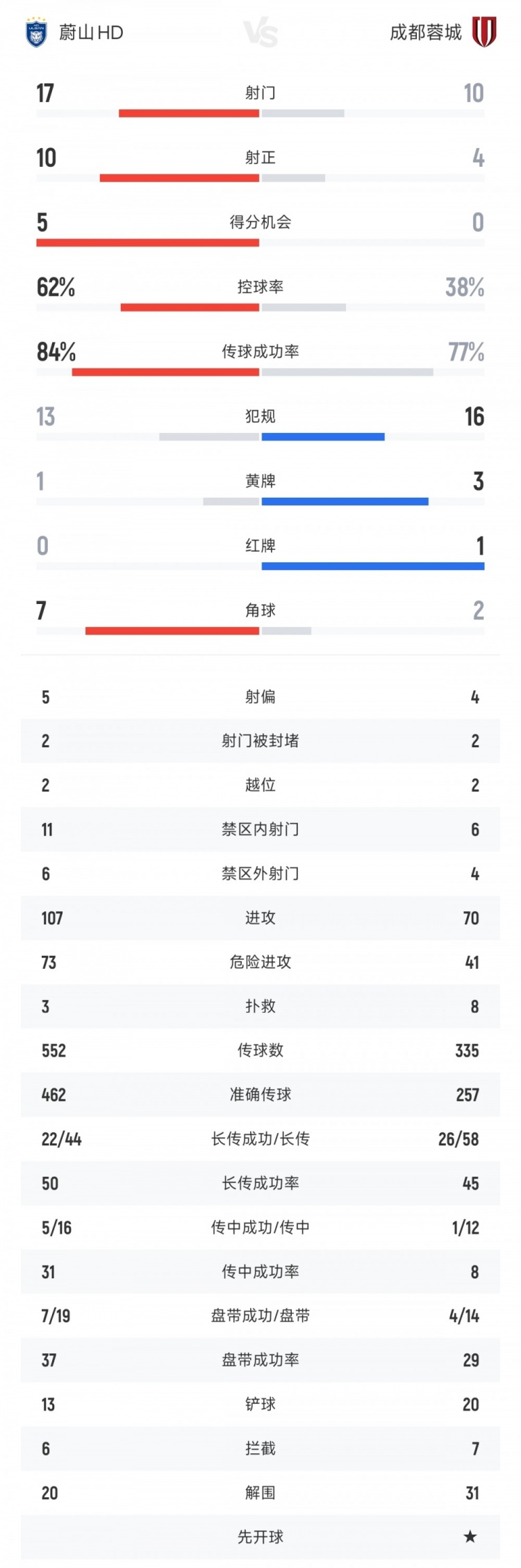 成都蓉城vs蔚山HD全場(chǎng)數據:射門(mén)比10-17 射正比4-10