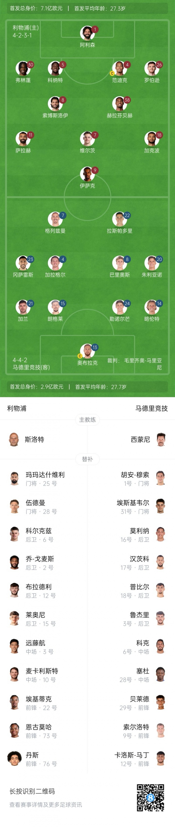 利物浦首發(fā):1-阿利森、4-范迪克、5-科納特、26-羅伯遜、30-弗林蓬、7-維爾茨、8-索博斯洛伊、38-赫拉芬貝赫、9-伊薩克、11-薩拉赫、18-加克波