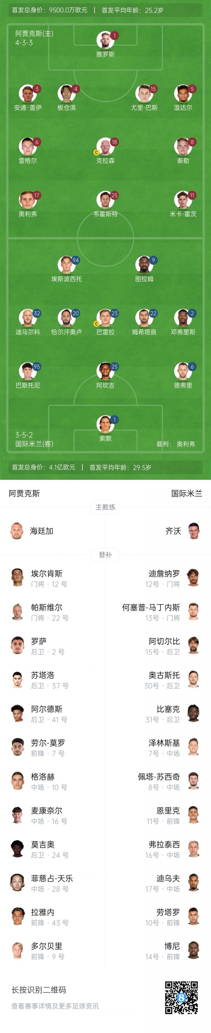 9月18日訊?歐冠聯(lián)賽階段第一輪,阿賈克斯主場(chǎng)迎戰國米比賽即將打響。賽前首發(fā)出爐。