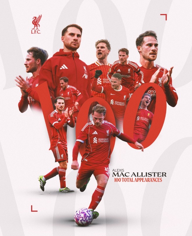 麥卡利斯特迎來(lái)利物浦生涯百場(chǎng)里程碑之戰,此前99場(chǎng)比賽,阿根廷人打進(jìn)14球并送出14次助攻。