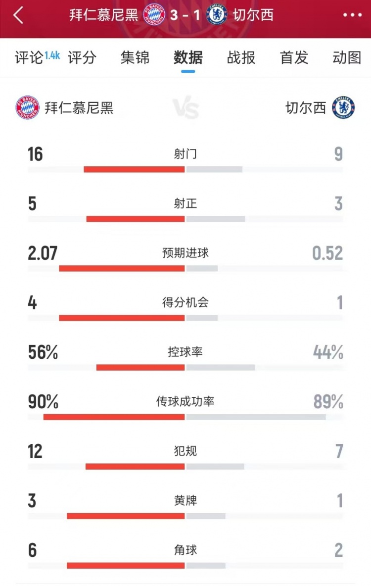 9月18日訊 拜仁在本輪歐冠焦點(diǎn)戰3-1力克切爾西,兩隊全場(chǎng)關(guān)鍵數據如下: