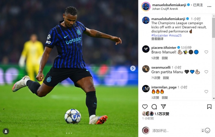 阿坎吉社媒曬出比賽照片,并寫(xiě)道:“以一場(chǎng)勝利開(kāi)啟歐冠征程,實(shí)至名歸的結果,紀律嚴明的表現?!?/p>