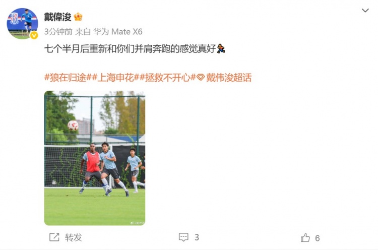 今天,戴偉浚在個(gè)人社媒曬出一張他參加球隊合練的照片,并配文:七個(gè)半月后重新和你們并肩奔跑的感覺(jué)真好。