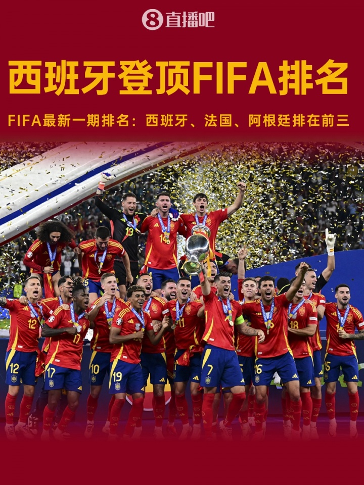 09月18日訊 FIFA國家隊最新一期排名公布,西班牙升至第一,法國第二,阿根廷跌至第三。