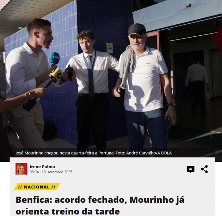 穆帥于昨日抵達葡萄牙,62歲的他將與本菲卡簽約到2027年。這位前費內巴切教練將由助理若昂-特拉良、佩德羅-馬查多以及與他一起在土耳其的體能教練安東尼奧-迪亞斯陪同。
