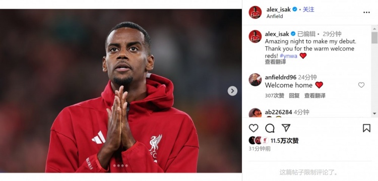 此役伊薩克首發(fā)出戰,上演利物浦首秀,賽后他在社交媒體上寫(xiě)道:“在美妙的夜晚迎來(lái)我的首秀,感謝紅軍球迷們的熱情歡迎!ynwa??”