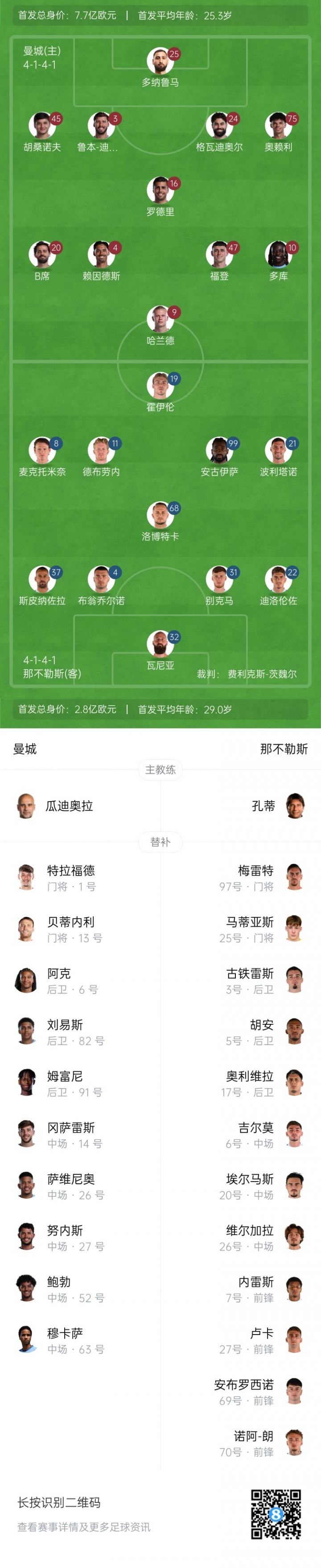 曼城替補:1-特拉福德、13-貝蒂內利、6-阿克、14-尼科·岡薩雷斯、26-薩維尼奧、27-努內斯、52-鮑勃、63-穆卡薩、82-劉易斯、91-姆富尼