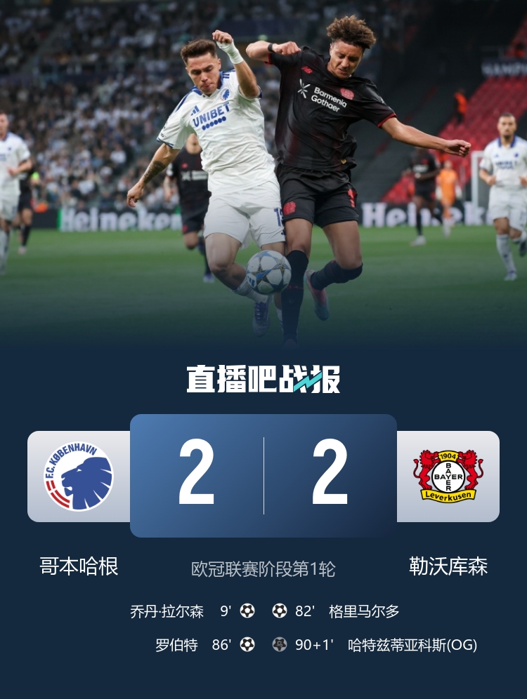 全場(chǎng)比賽結束,哥本哈根2-2勒沃庫森。
