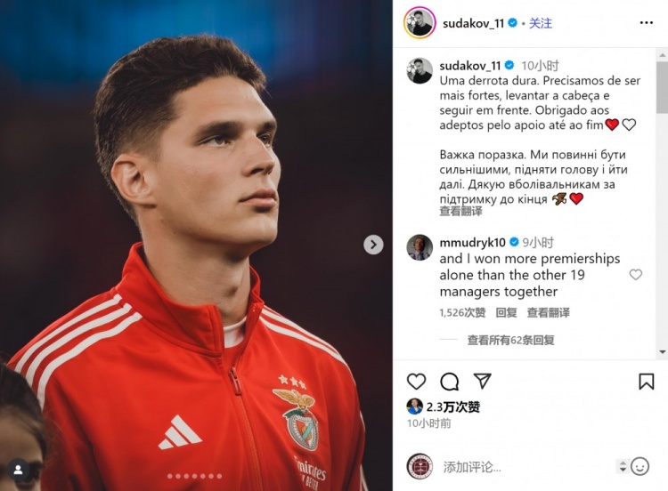 效力于本菲卡的烏克蘭中場(chǎng)蘇達科夫賽后在ins上寫(xiě)道:“一場(chǎng)慘痛的失利,我們需要更堅強,昂首挺胸繼續前進(jìn),感謝球迷們直到最后的支持?!?/p>
