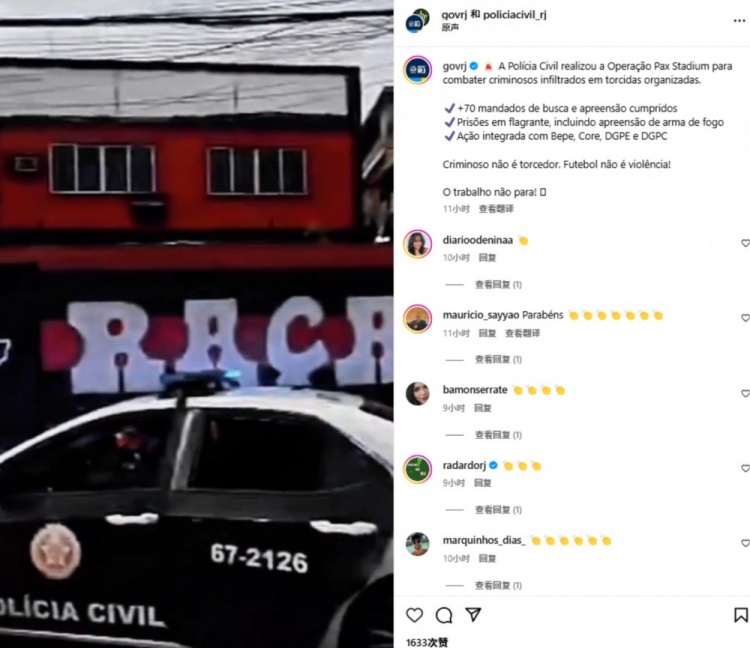 警方對弗拉門(mén)戈、達伽馬、博塔弗戈、弗魯米嫩塞這四家俱樂(lè )部的極端球迷進(jìn)行了70多次搜查,繳獲了包括突擊步槍和彈藥在內的眾多武器。在警方的行動(dòng)中,有1名嫌犯死亡,2人被逮捕,嫌犯在社交媒體上用代號組織了最近導致傷亡的球迷斗毆。