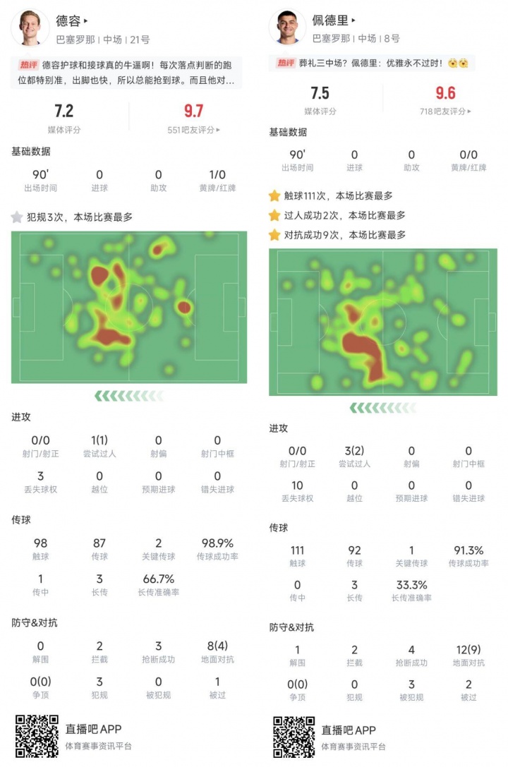 28歲的德容持球數據更離譜,98次觸球87次傳球,丟失球權只有3次!傳球成功率98.9%!防守方面,德容也有2攔截3搶斷,8次對抗4成功。