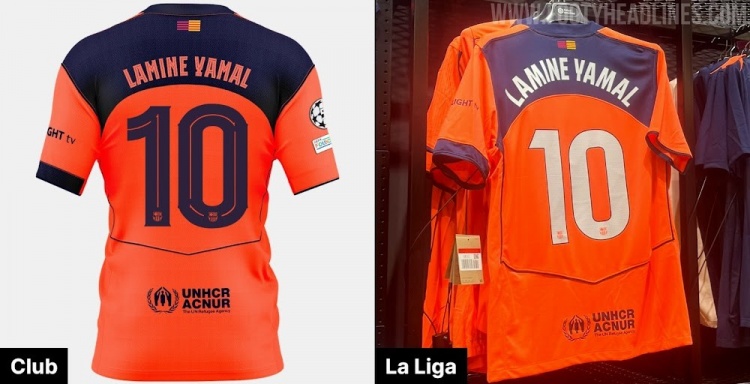 巴薩官方并未提供西甲印字版本的球衣,目前流傳的版本是通過(guò)獨立經(jīng)銷(xiāo)商Futbol Emotion流出,雖可能存在零售商的細微誤差,但通常零售商的字號套裝都是直接來(lái)自西甲官方供應商Avery Dennison,因此理論上應該準確無(wú)誤。