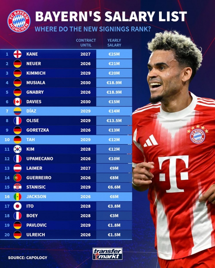9月20日訊 德國轉會(huì )市場(chǎng)列出了拜仁球員的年薪榜單,凱恩2500萬(wàn)歐居首,諾伊爾2100萬(wàn)歐次席,杰克遜600萬(wàn)歐。