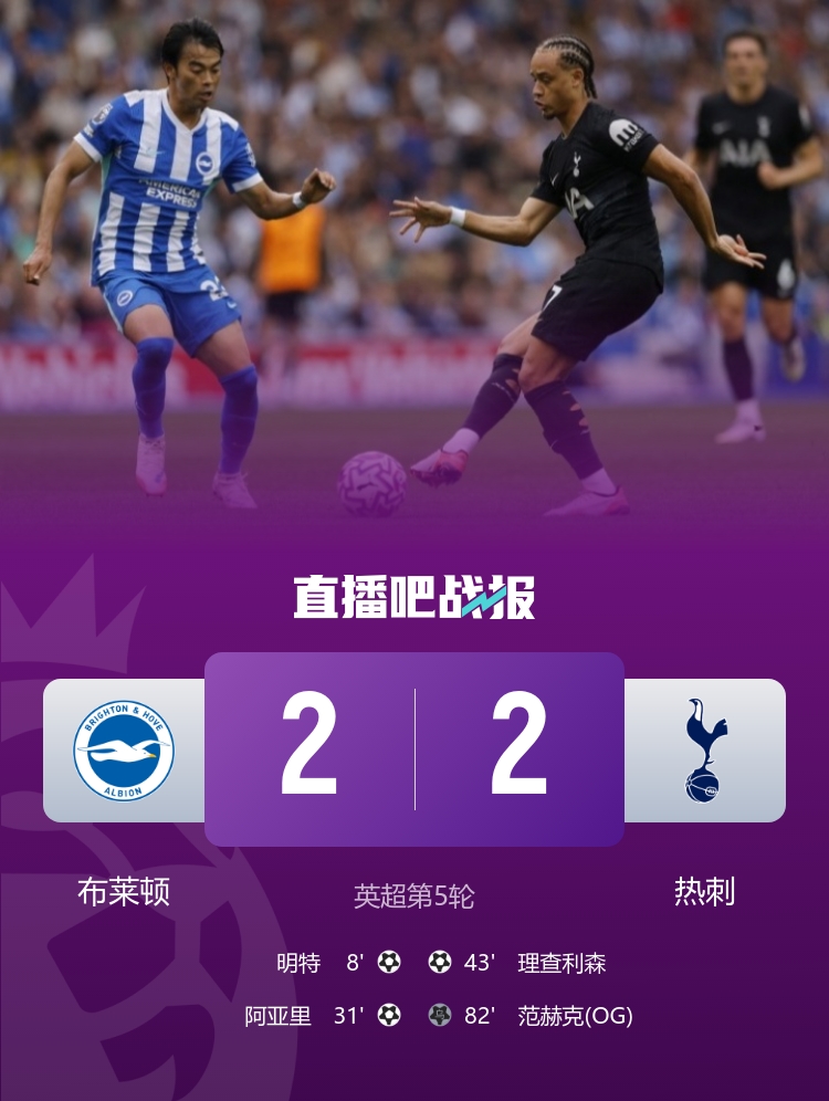 9月20日訊 北京時(shí)間9月20日晚上22:00,英超第5輪,布萊頓坐鎮美國運通社區球場(chǎng)迎戰熱刺。上半場(chǎng),明特破門(mén),阿亞里世界波,理查利森亂戰建功。下半場(chǎng),范赫克自擺烏龍。全場(chǎng)結束,布萊頓2-2熱刺。本場(chǎng)過(guò)后,熱刺3勝1平1負積10分暫升第2,布萊頓1勝2平2負積5分排名第12。