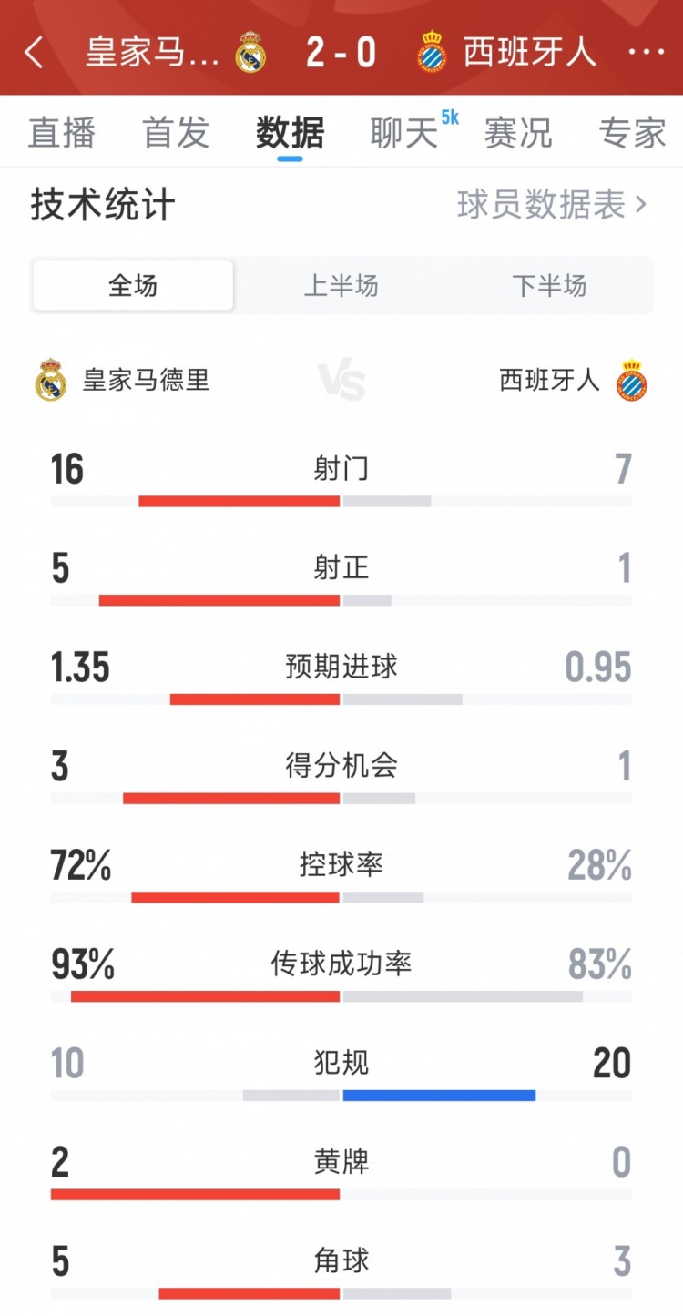9月21日訊 在本輪西甲,皇馬2-0擊敗西班牙人,以下為雙方全場(chǎng)數據對比: