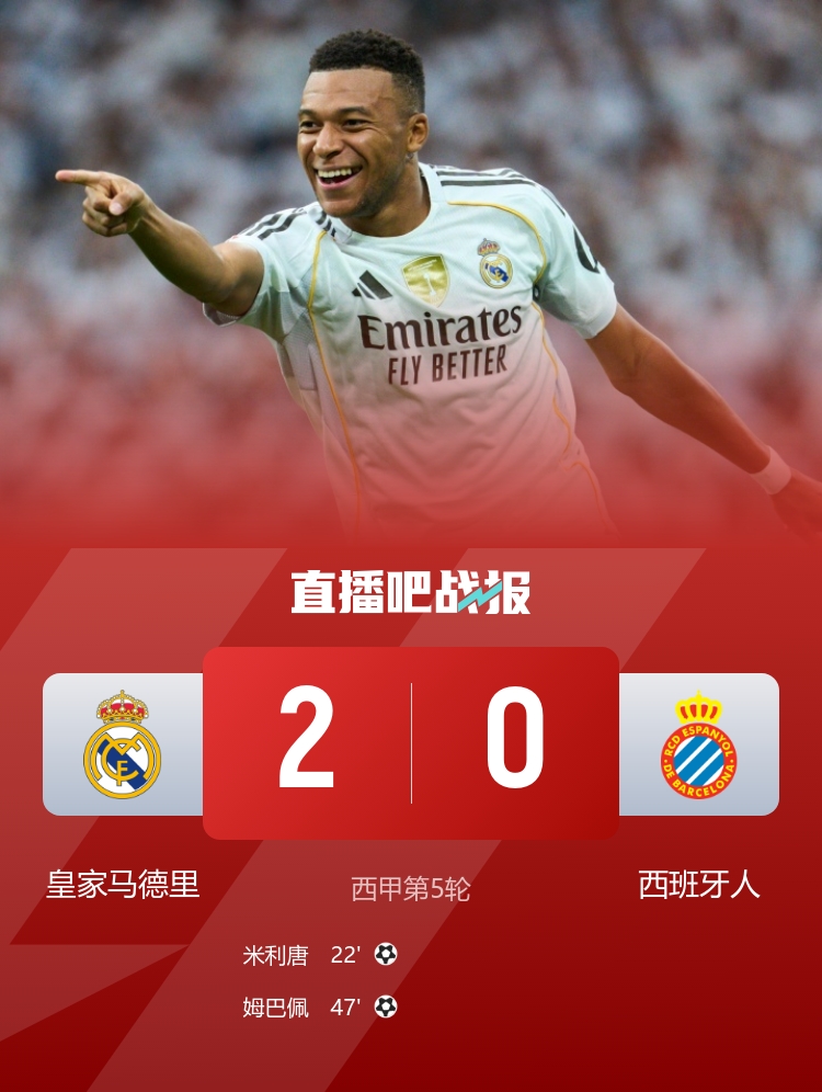 9月20日訊 北京時(shí)間9月20日22時(shí)15分,西甲第5輪,皇馬坐鎮伯納烏球場(chǎng)迎戰西班牙人。上半場(chǎng),米利唐世界波首開(kāi)紀錄?;蜀R半場(chǎng)1-0領(lǐng)先西班牙人。下半場(chǎng),姆巴佩也轟進(jìn)一粒世界波。最終皇馬2-0擊敗西班牙人,取得聯(lián)賽5連勝,繼續領(lǐng)跑西甲。