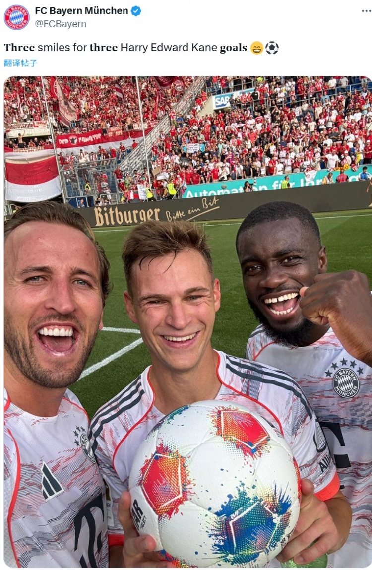 本場(chǎng)比賽凱恩上演帽子戲法,拜仁官推也在賽后曬出凱恩與隊友基米希、于帕以及比賽用球的合影。