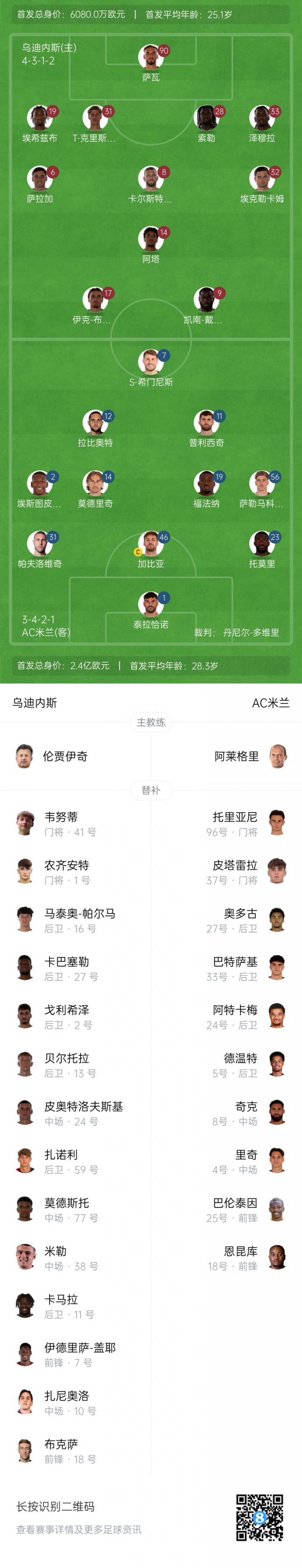 9月21日訊?意甲第4輪,烏迪內斯主場(chǎng)迎戰米蘭比賽即將打響。賽前首發(fā)出爐。