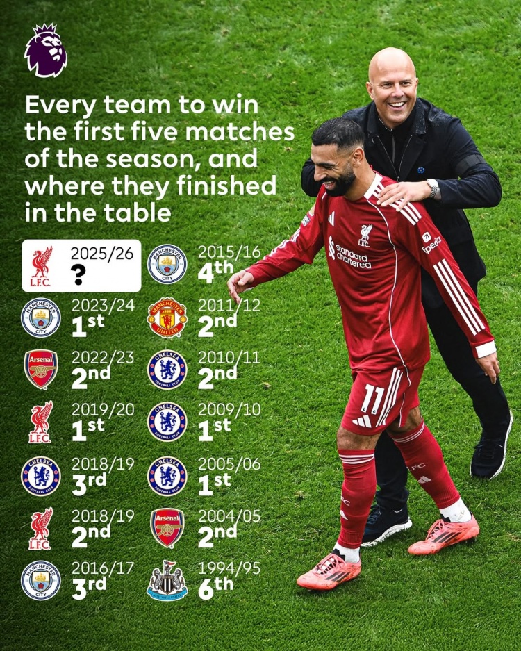 據英超官方統計,英超歷史上共有14支球隊賽季開(kāi)局5連勝(包括本賽季利物浦),此前做到這點(diǎn)的13支球隊之中,4支球隊最終贏(yíng)得當賽季英超冠軍,分別是切爾西(2次)、利物浦和曼城。