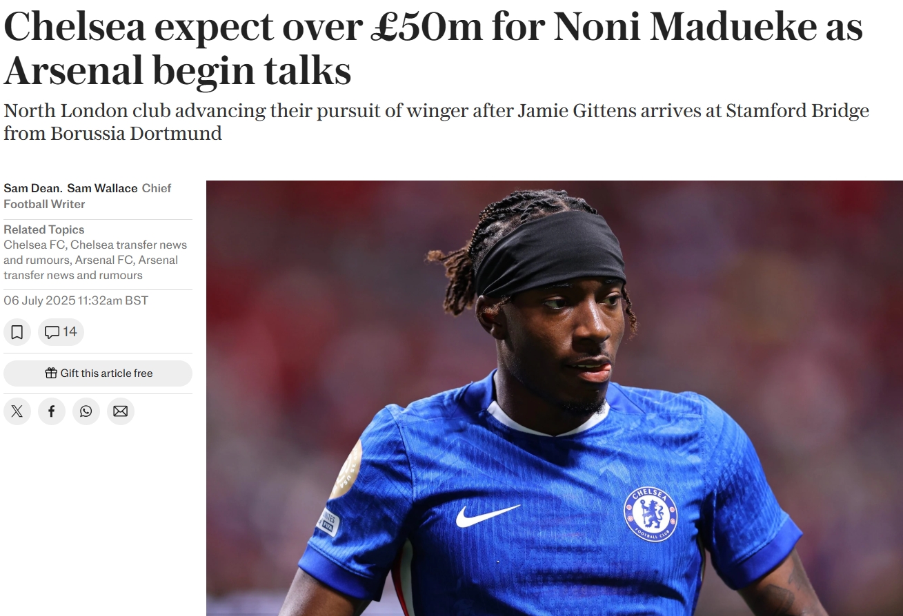 07月06日訊 英媒《每日電訊報》最新消息,切爾西對馬杜埃凱的要價(jià)超5000萬(wàn)英鎊,阿森納正在就轉會(huì )進(jìn)行談判。