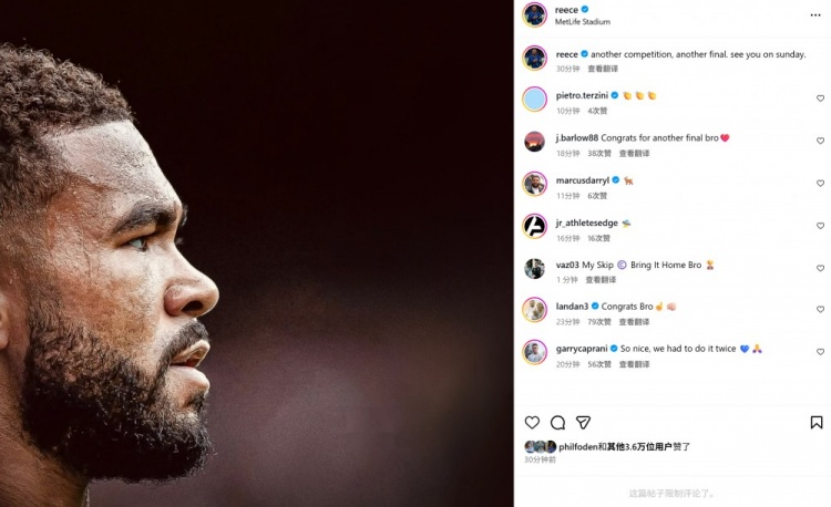本場(chǎng)比賽里斯-詹姆斯替補登場(chǎng),賽后在社媒曬照慶祝勝利,配文寫(xiě)道:“又一項賽事,又一場(chǎng)決賽,我們周日再見(jiàn)!”