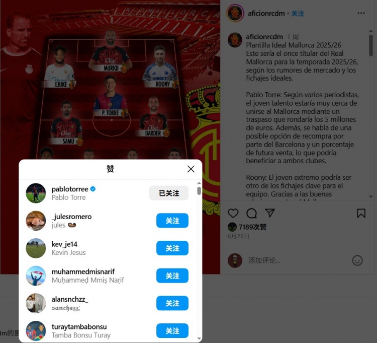 托雷明確表態(tài)只愿加盟馬略卡,并拒絕了阿賈克斯等歐洲其他俱樂(lè )部的邀約。事實(shí)上,他在社交媒體上點(diǎn)贊相關(guān)動(dòng)態(tài)的舉動(dòng)已引發(fā)關(guān)注。Instagram賬號aficionrcdm發(fā)布的馬洛卡下賽季潛在首發(fā)陣容中,托雷作為前腰與薩姆-科斯塔、塞爾吉-達德?tīng)柦M成中場(chǎng)三角,而球員本人對該帖的點(diǎn)贊行為進(jìn)一步點(diǎn)燃了球迷熱議。