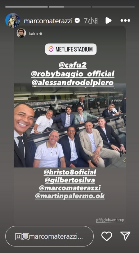 世俱杯半決賽,切爾西擊敗弗魯米嫩塞晉級決賽,多位足壇傳奇現場(chǎng)觀(guān)戰,卡卡發(fā)布與卡福、巴喬、馬特拉齊、皮耶羅等人的合照,馬特拉齊轉發(fā)。特雷澤蓋則發(fā)布了與馬特拉齊、帕勒莫的合影,馬特拉齊同樣轉發(fā)。