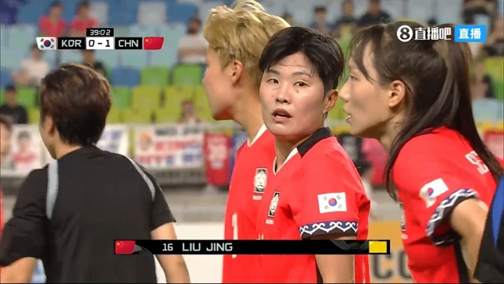 07月09日訊 韓國女足vs中國女足第39分鐘,劉靖一記窩心腳踢倒韓國女足球員,吃到1張黃牌。