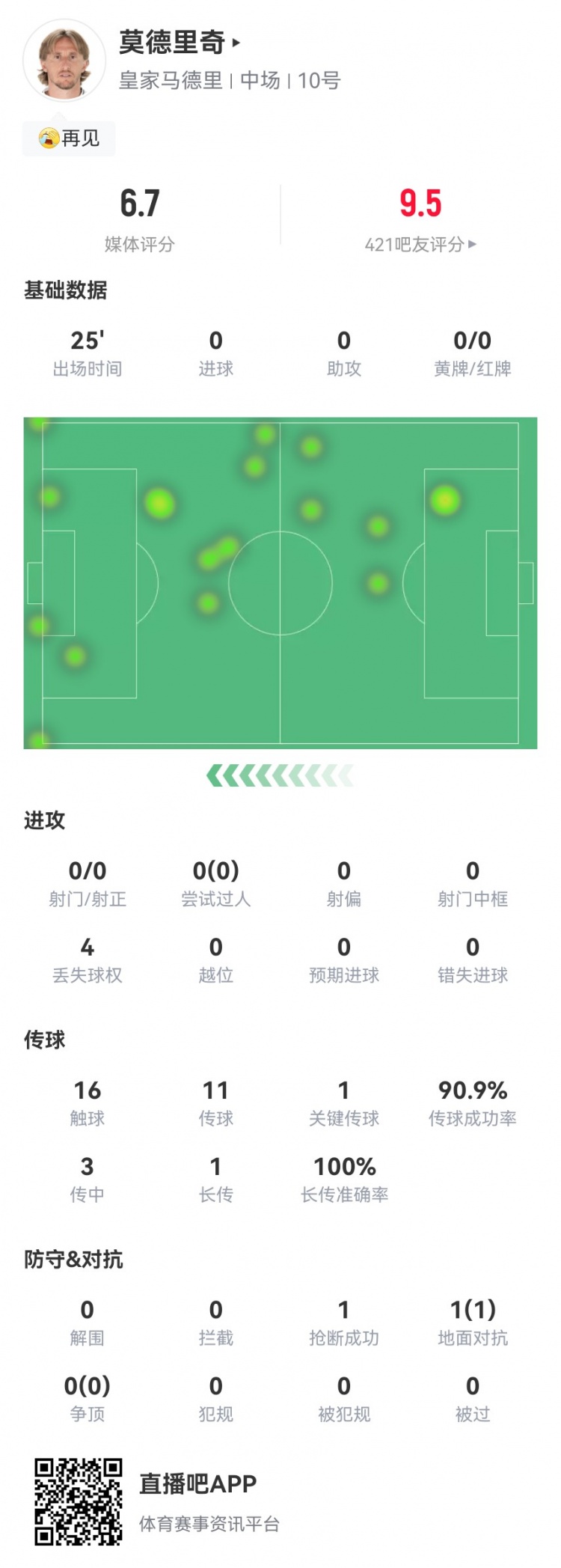 7月10日訊 皇馬在世俱杯半決賽0-4慘敗巴黎,莫德里奇本場(chǎng)數據如下: