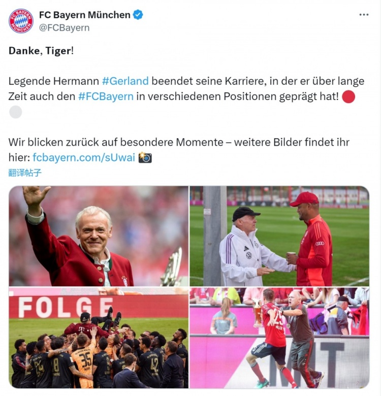 7月10日訊 拜仁傳奇助教赫爾曼-格蘭德退休,拜仁官方社媒致謝。