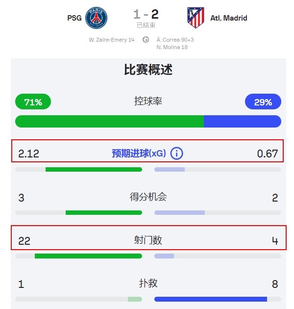 與馬競之戰,巴黎射門(mén)數22比4領(lǐng)先,控球率高達71%,預期進(jìn)球2.12比0.67是對手的3.2倍,卻在最后時(shí)刻被馬競絕殺。