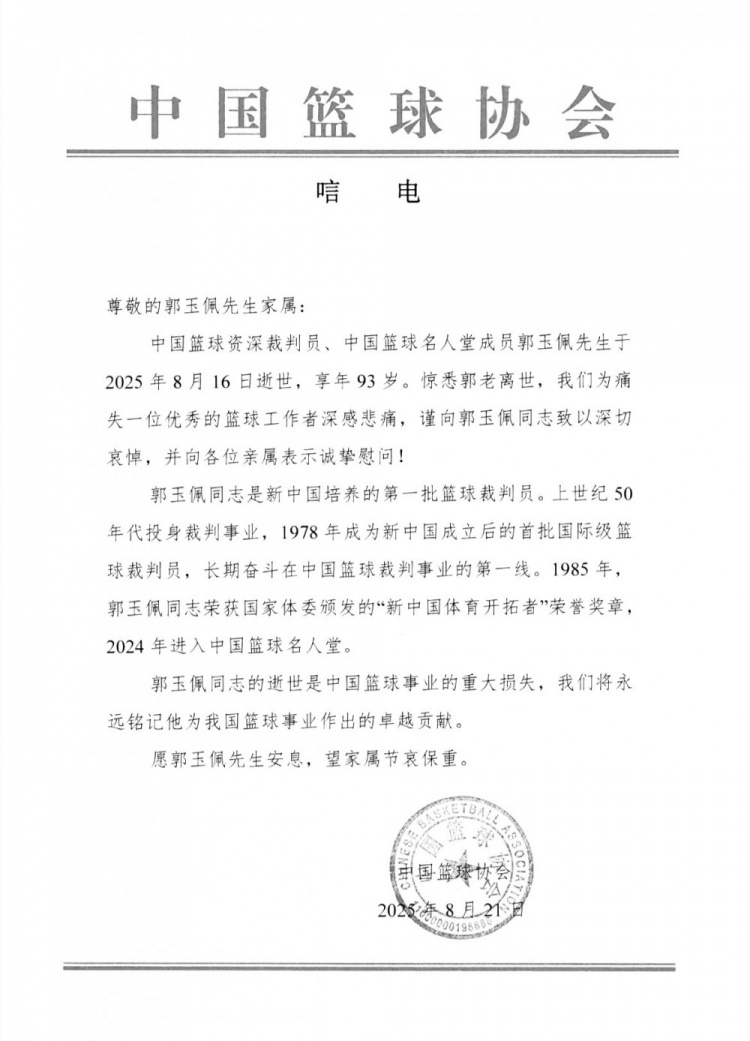 中國籃球資深裁判員、中國籃球名人堂成員郭玉佩先生于2025年8月16日逝世,享年93歲。驚悉郭老離世,我們?yōu)橥词б晃粌?yōu)秀的籃球工作者深感悲痛,謹向郭玉佩同志致以深切哀悼,并向各位親屬表示誠摯慰問(wèn)!