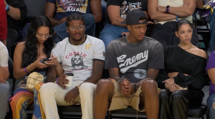 場(chǎng)邊,太陽(yáng)球員杰倫-格林攜40歲的女友Draya,與前隊友小賈巴里-史密斯及其女友一同場(chǎng)邊觀(guān)戰飛翼VS火花的比賽。