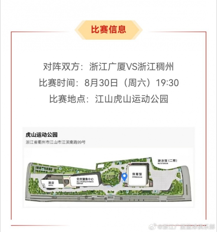 比賽將于8月30日19點(diǎn)半在浙江省江山市虎山運動(dòng)公園體育館進(jìn)行,這也是兩隊休賽期的首秀。