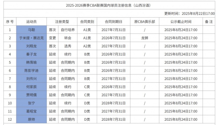8月22日訊 CBA官網(wǎng)更新了山西男籃新賽季的國內球員注冊信息,山西共注冊了12人。