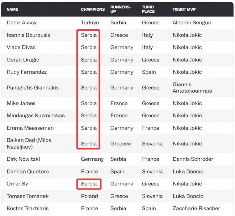 看好塞爾維亞的,包括迪瓦茨、德拉季奇、魯迪-費爾南德斯、邁克-詹姆斯、庫茲明斯卡斯。諾維茨基則看好祖國德國奪冠。