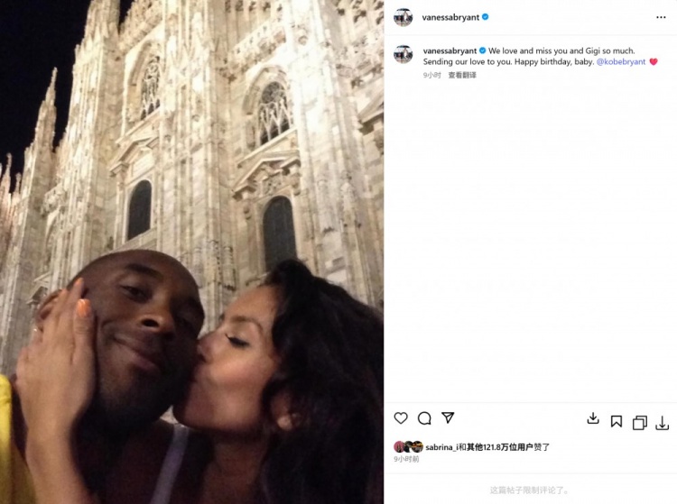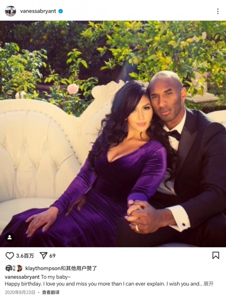 科比去世至今,瓦妮莎每年8月23日都在社媒上為科比送生日祝福。