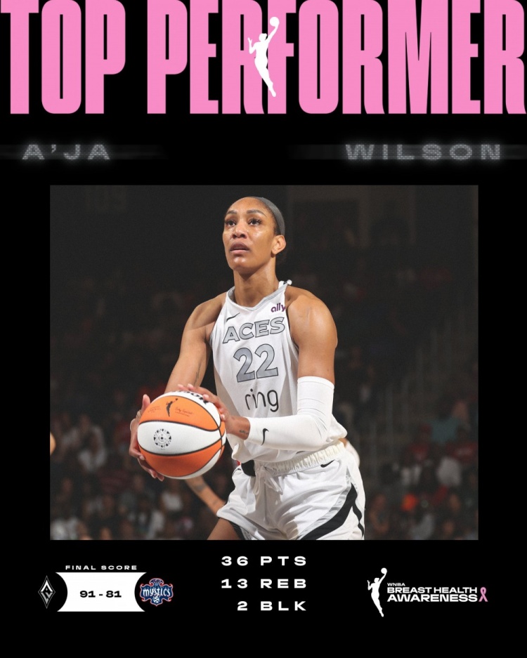 根據數據統計,這是阿賈-威爾遜本賽季第9次砍下30+10,她超越去年的自己(8次),成為WNBA歷史上單賽季30+10板場(chǎng)次最多的球員。