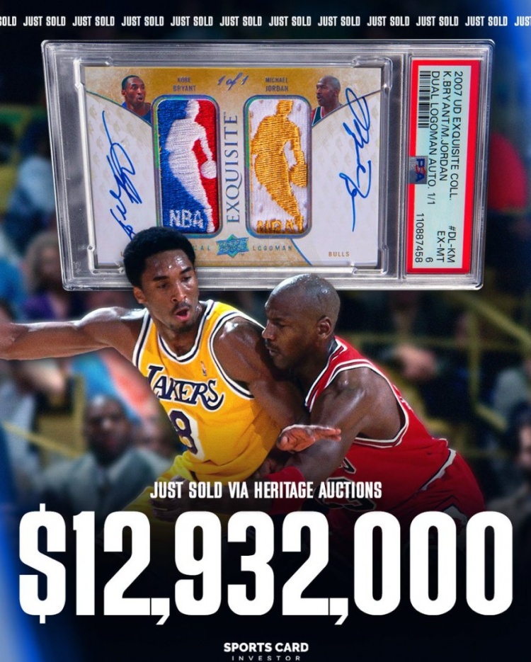8月24日訊 據The Athletic報道,一張獨一無(wú)二的2007-08賽季Upper Deck Exquisite Collection系列喬丹與科比雙LogoMan(來(lái)自他們各自比賽穿過(guò)的球衣上的NBA標志補?。┖灻a丁卡,在(美國當地時(shí)間)周日凌晨通過(guò)Heritage Auctions拍賣(mài)行以1293.2萬(wàn)美元的價(jià)格售出。
