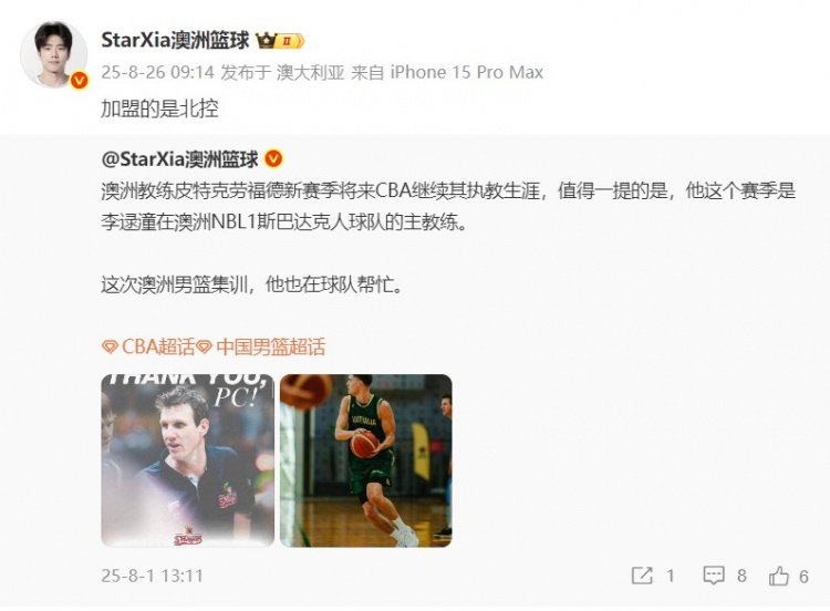 8月26日訊 據媒體人@StarXia澳洲籃球 報道,澳洲教練皮特-克勞福德加盟北控教練組。