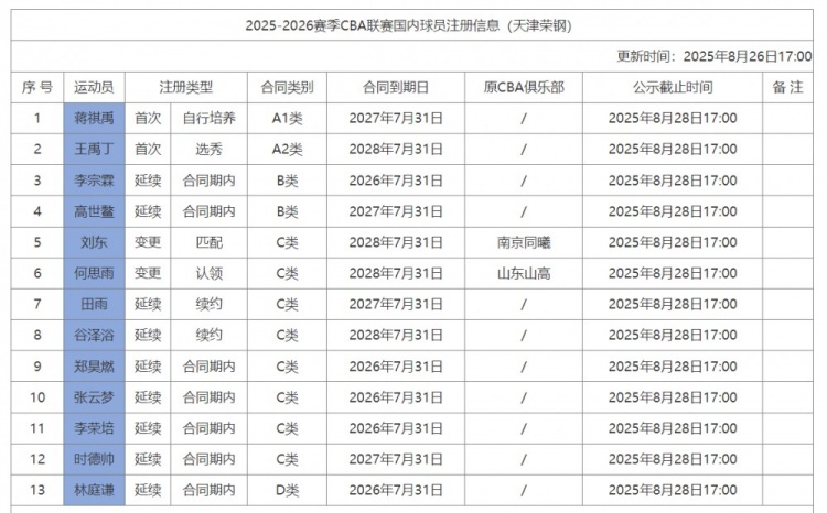 8月26日訊 CBA官網(wǎng)更新了天津男籃新賽季的國內球員注冊信息,天津共注冊了13人。