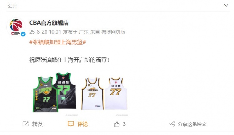 “祝愿張鎮麟在上海開(kāi)啟新的篇章?!盋BA官方旗艦店官博在圖片旁邊寫(xiě)道。