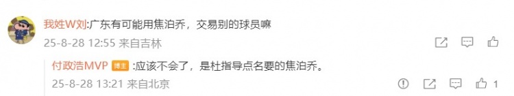 有網(wǎng)友問(wèn)廣東有沒(méi)可能用焦泊喬交易別的球員,付政浩回復:“應該不會(huì )了,是杜指導點(diǎn)名要的焦泊喬?!?/p>