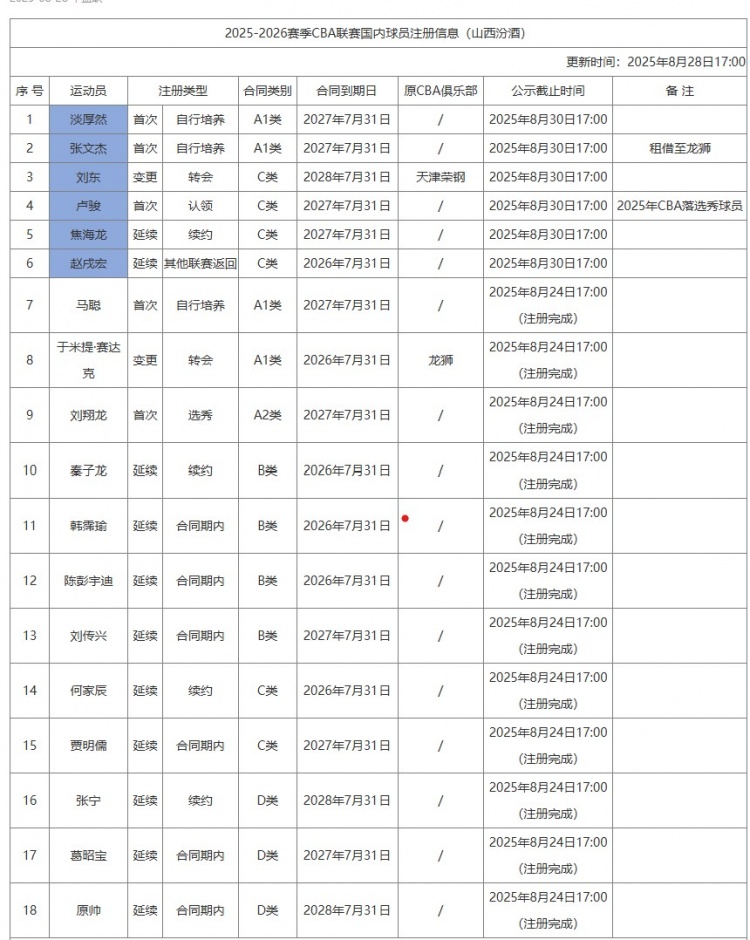 8月28日訊 今天,CBA官網(wǎng)更新了2025-26賽季球員注冊信息,山西大名單如下: