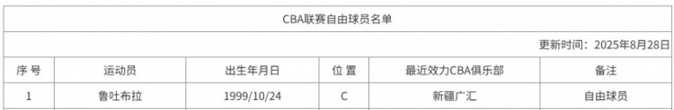 8月28日訊 CBA官網(wǎng)今天更新了聯(lián)賽自由球員名單,相比上一期,新增魯吐布拉,為完全自由球員。