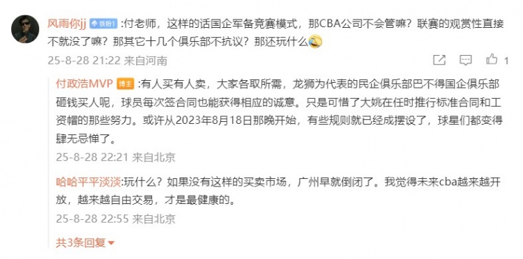 8月28日訊 今天,媒體人付政浩在社媒和網(wǎng)友互動(dòng),談到了趙睿加盟北京男籃的消息。