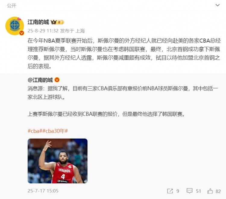 @江南的城 在個(gè)人微博上寫(xiě)道:“在今年NBA夏季聯(lián)賽開(kāi)始后,斯佩爾曼的外方經(jīng)紀人就已經(jīng)向赴美的各家CBA總經(jīng)理推薦斯佩爾曼,當時(shí)斯佩爾曼也在考慮韓國聯(lián)賽,最終,北京首鋼成功拿下斯佩爾曼,據其外方經(jīng)紀人透露,斯佩爾曼減重頗有成效,拭目以待他加盟北京首鋼之后的表現?!?/p>